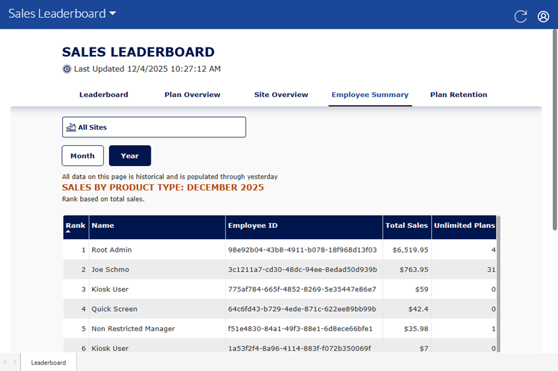 The Insights 2.0 Sales Leaderboard dashboard provides an interactive, performance-driven view into employee sales activity. The dashboard helps operators visualize rankings, trends, and retention patterns across plans and sites, empowering leaders to identify top performers and opportunities for coaching. The employee summary table is also exportable and can be used for manual commission calculations. Detailed information about each dashboard is provided below.
