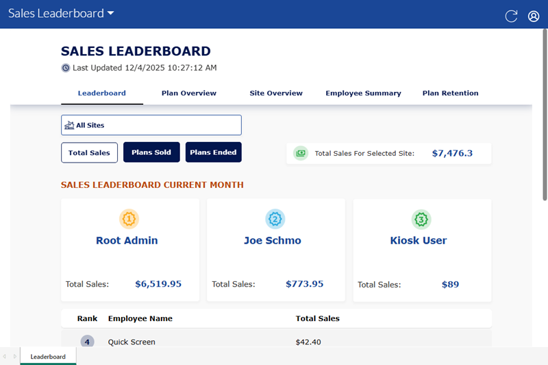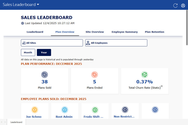 The Plan Overview dashboard provides key metrics such as: total plans sold (filterable by month, year, or employee), employees selling plans vs. average plans sold, and plans ended, including terminated or discontinuing statuses. Use it to assess plan health and individual contribution over time.