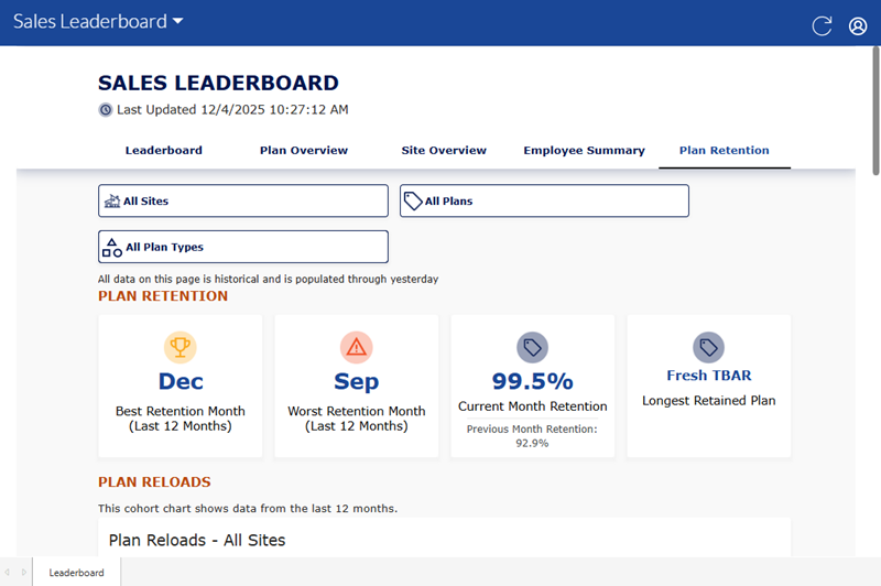 The Plan Retention dashboard tracks how long employees retain plans, measured in recurring payment cycles. Enables visibility into retention duration by employee, supporting long-term performance tracking and training opportunities.