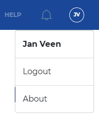 The About menu opens and closes when the logged in user's initials in the top right corner of the Patheon Portal header) are selected. It contains the current user's first name and last name, a function to immediately log out and close the Patheon Portal application, and access to the Patheon Portal application's version number.