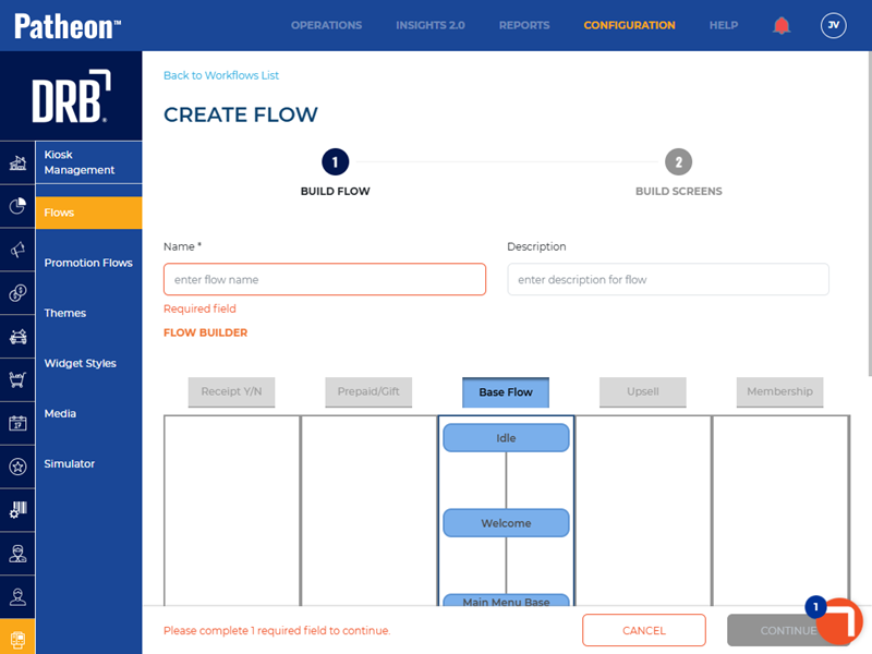 The Create Flow panel opens when the function is selected from the FLOWs List panel. It is used to configure a new kiosk workflow.