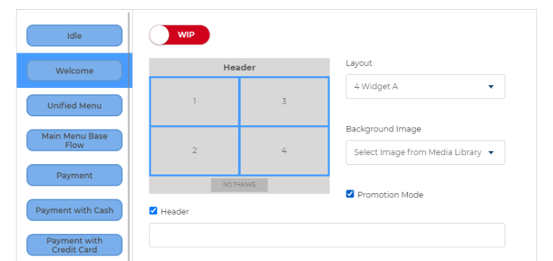Note: If the workflow doesn't include the Unified Menu screen, Promotion Mode is disabled for the Welcome screen..