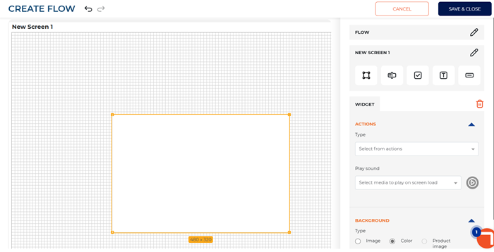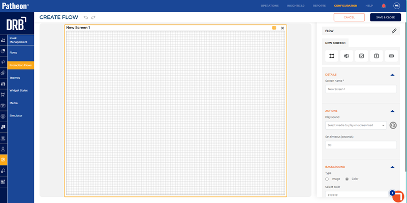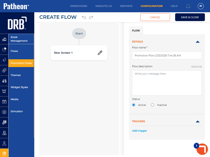 The Create Flow (Promotion Flows) panel opens when the function is selected from the Promotion FLOWS panel. It is used to configure a new kiosk promotion workflow.