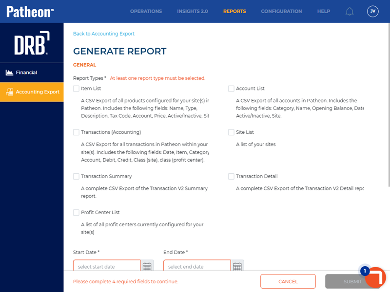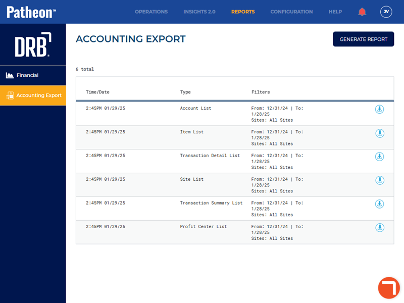 The Accounting Export panel provides a list of all previously generated CSV export files, as well as the ability to generate and download any of the following export files, by site(s) and date range: item list, account list, transactions list, site list, transaction (v2) summary report, transaction (V2) detail report, or profit center list.