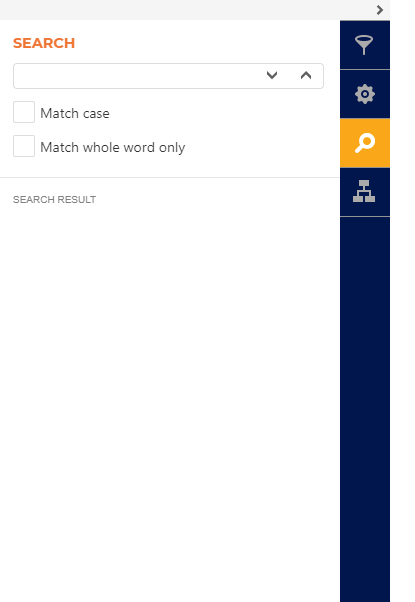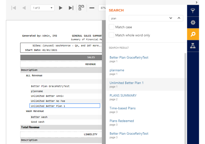 Use the search function to locate all instances of a search term in a generated report. Selecting the function opens the sidebar Search section.