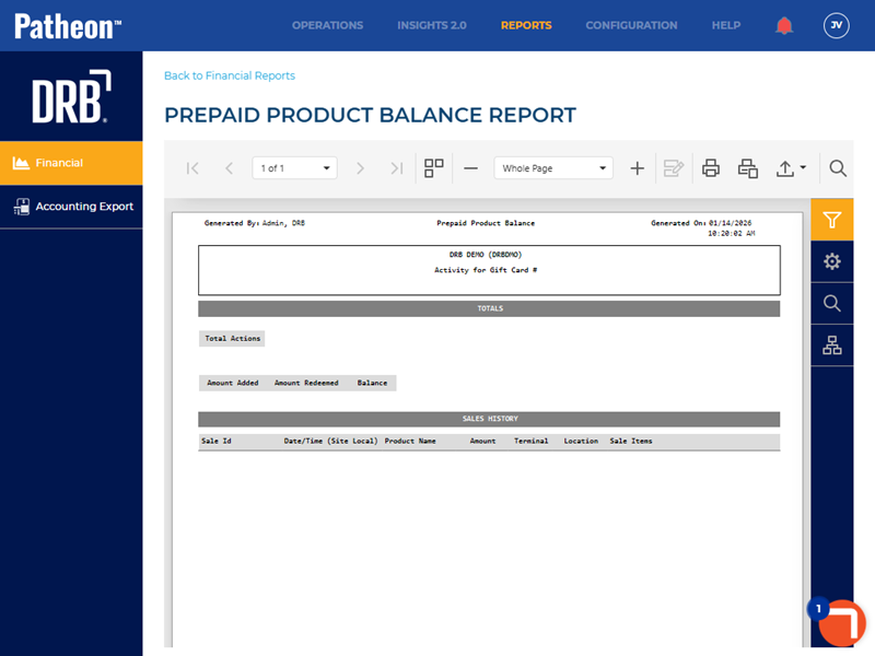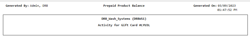 The Prepaid Product Balance Report provides a way for sites to view a specific prepaid's, gift card's or ticket book's balance and activity. Use this report to quickly and easily reconcile prepaids.