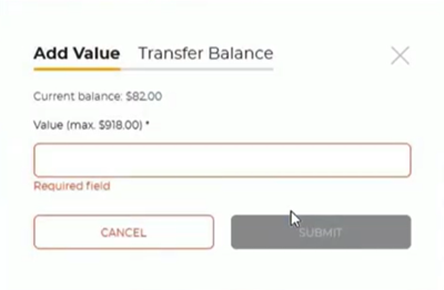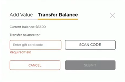 - In Transfer balance to*, manually enter the code of the gift card to which the balance is being tranferred to and select , or select and scan the gift card. The dialog closes and both gift cards are added to the cart. Note: The gift card from which the balance is being transferred has a negative (-) value in the cart, and the gift card to which the balance is being transferred has a positive (+) value in the cart.